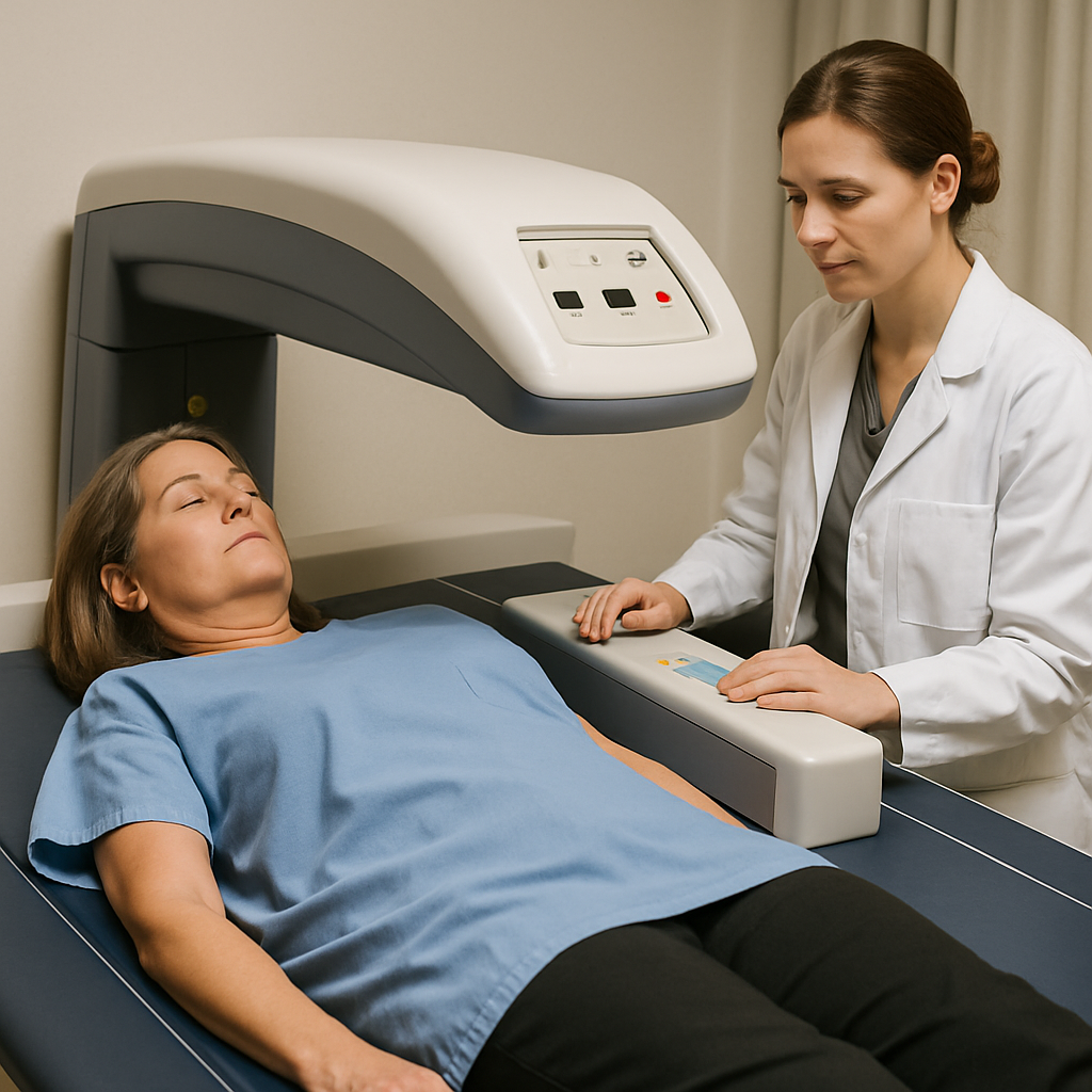 DXA(이중에너지 X선 흡수계측)로 척추·대퇴골의 골밀도를 측정합니다. WHO 기준 T-score는 정상 ≥ -1.0 / 골감소증 -1.0~-2.5 / 골다공증 ≤ -2.5입니다.