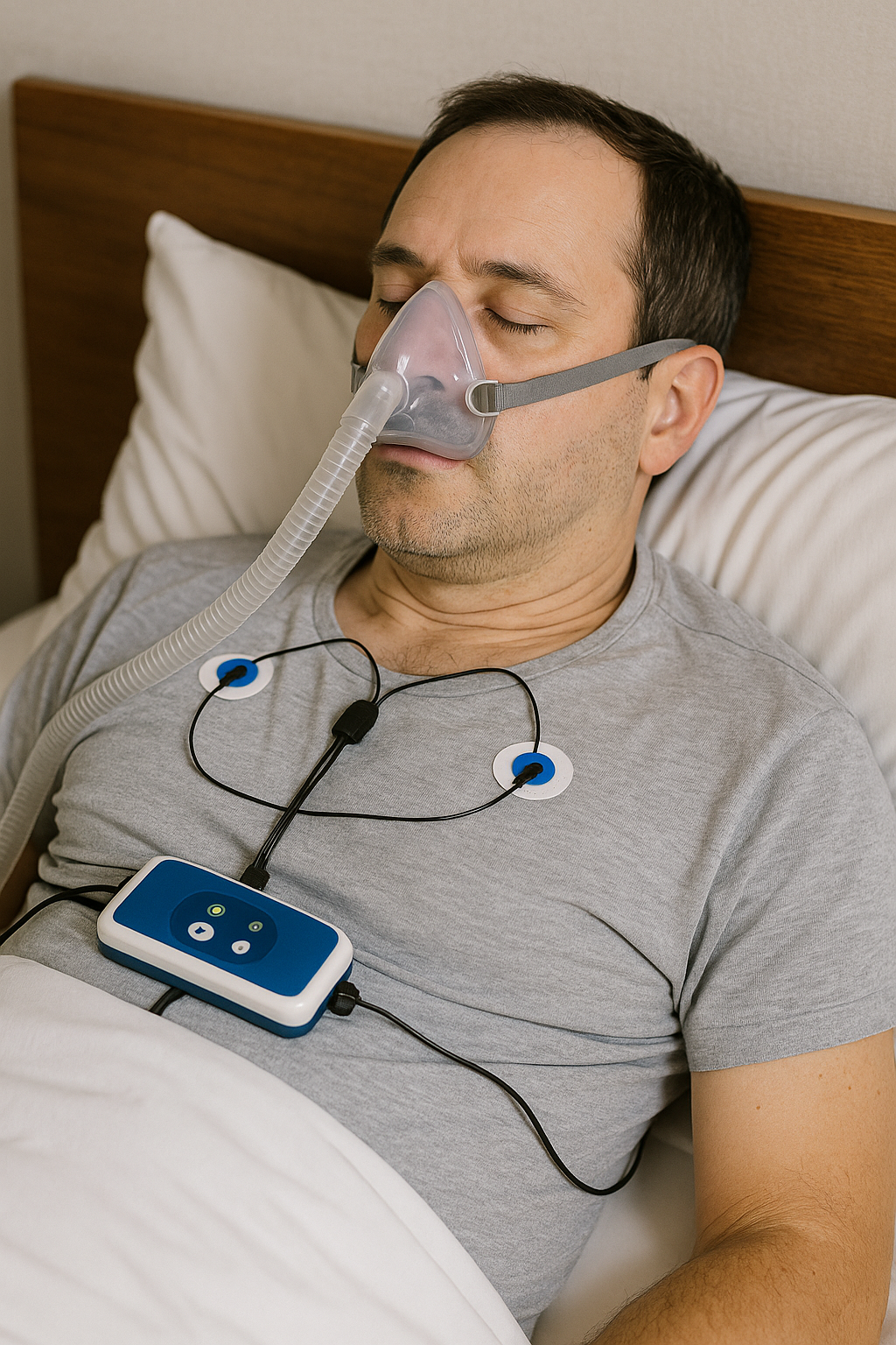 이 검사는 뇌파, 호흡, 산소포화도, 심박수 등을 동시에 측정하여 무호흡지수(AHI)를 계산합니다.