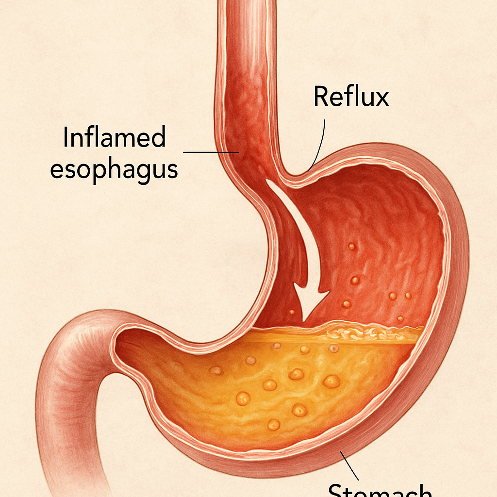 역류성 식도염(GERD, Gastroesophageal Reflux Disease)은 위 내용물, 특히 위산이 식도로 역류하면서 식도 점막에 염증을 유발하는 질환입니다. 식도 하부 괄약근의 기능 약화, 위 내 압력 증가 등이 주요 원인입니다.