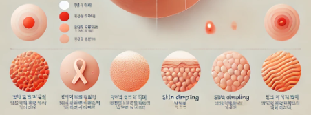 피부가 오렌지껍질처럼 울퉁불퉁해지거나, 유두가 안쪽으로 함몰되는 현상도 의심 증상 중 하나입니다. 또한 피부가 붉게 변하거나 부종이 나타날 수도 있습니다.