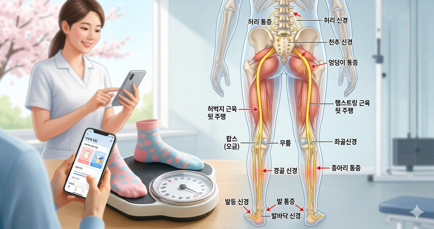- 엉덩이부터 다리까지 이어지는 방사통: 통증이 한곳에 머물지 않고 타고 내려가는 느낌이 듭니다.